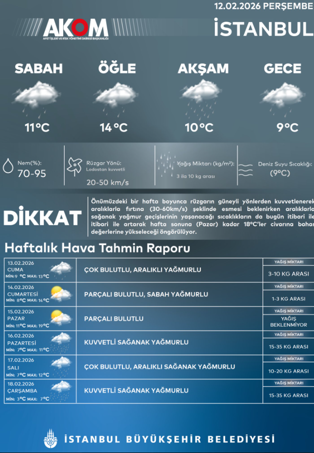 İstanbul Büyükşehir Belediyesi (İBB) Afet Koordinasyon Merkezi (AKOM), tarafından yapılan haftalık hava tahmin raporuna göre “Önümüzdeki bir hafta boyunca rüzgarın güneyli yönlerden kuvvetlenerek aralıklarla fırtına (30-60km/s) şeklinde esmesi beklenirken aralıklarla sağanak yağmur geçişlerinin yaşanacağı sıcaklıkların da bugün itibari ile artarak hafta sonuna (Pazar) kadar 18 dereceler civarına bahar değerine yükseleceği öngörülüyor” denildi.