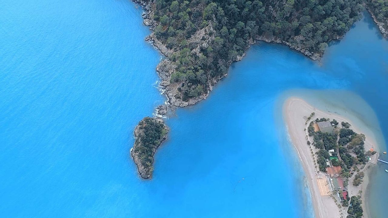 azı turistler de turkuaza dönüşen deniz manzarası eşliğinde hatıra fotoğrafı çektirdi. Tandem yamaç paraşütü pilotu Mehmet Gönüllü tarafından GoPro ve fotoğraf makinası ile çekilen havadan görüntülerle, Ölüdeniz Plajı’ndaki renk değişimi görüntülendi.